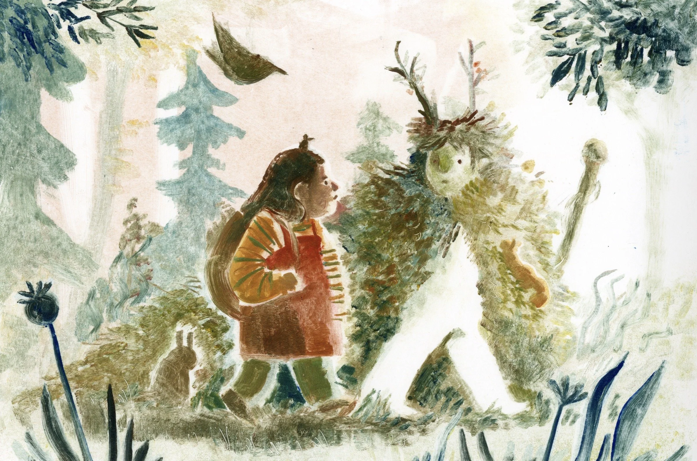 She is heavily inspired by childhood memories and feelings, as well as the Scottish Highlands that she grew up in. Her work often takes on themes of loneliness, friendship and folklore. Her goal is for her art to evoke a feeling of cosiness and comfort as well as a sense of wonder.